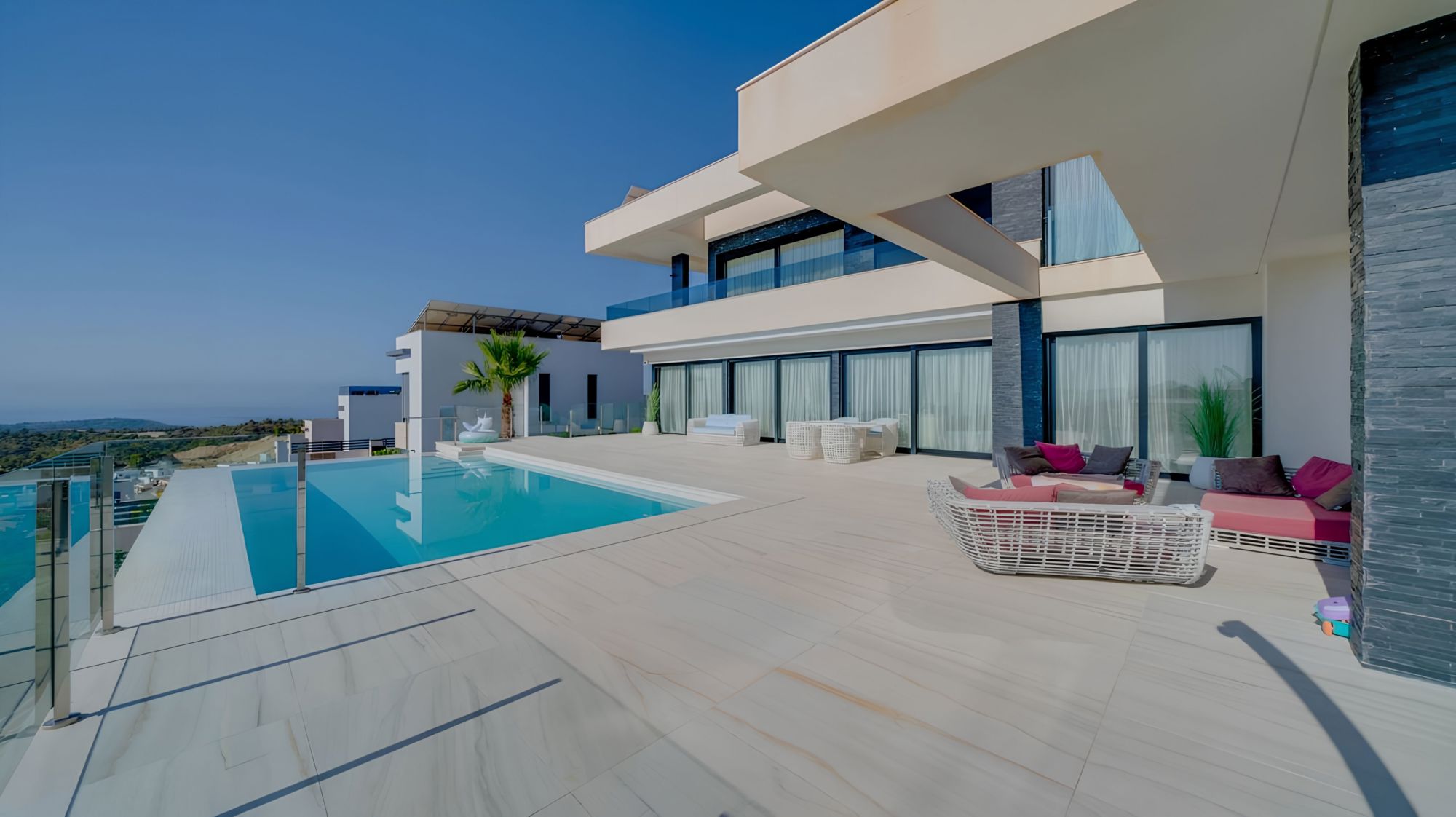 Из панорамных окон виллы открывается захватывающий вид на море и горы.