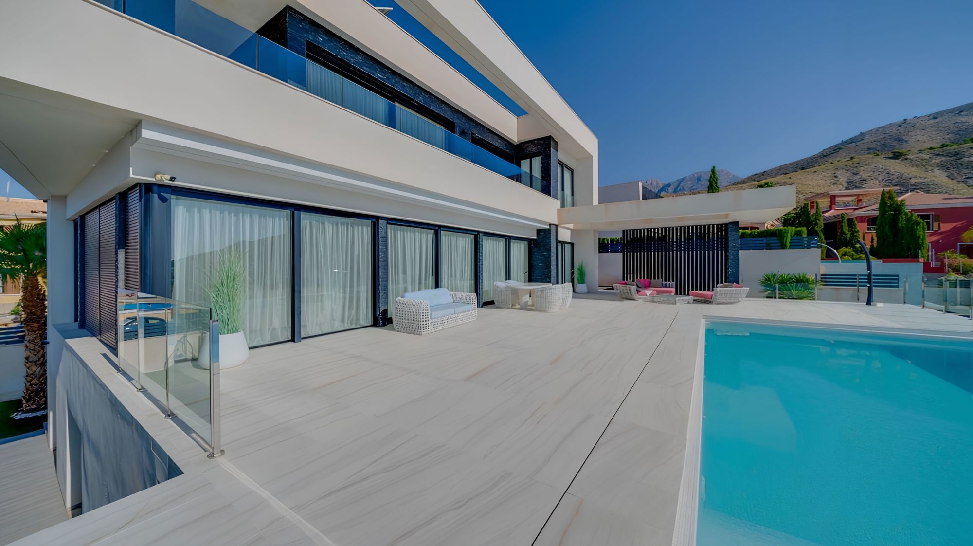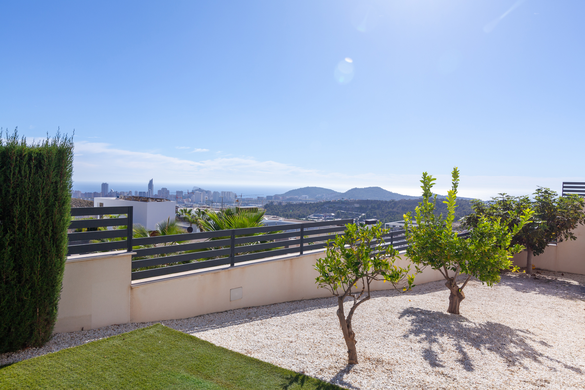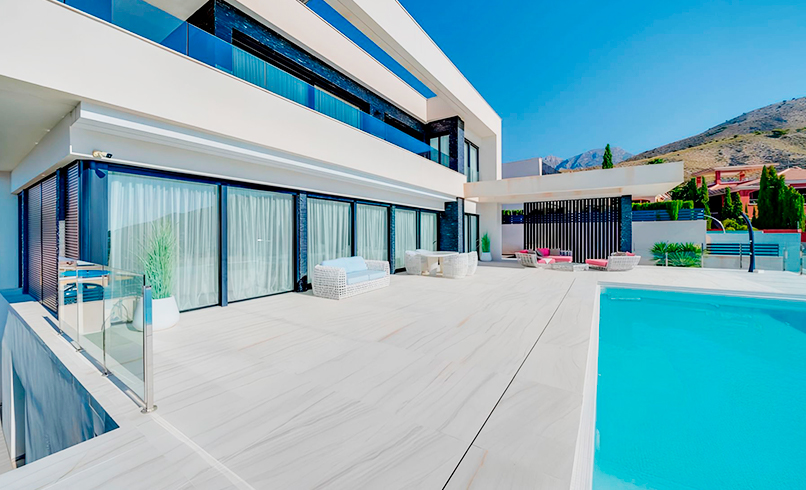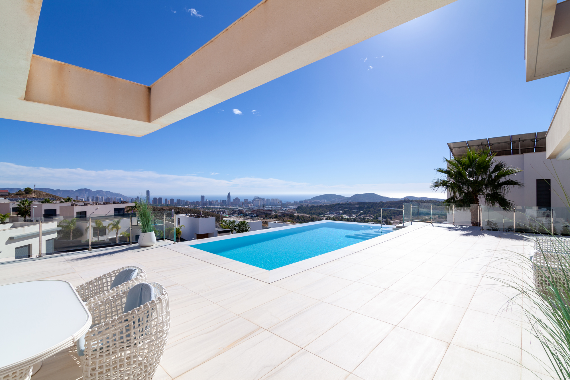 В этом доме есть две террасы. На большой террасе есть "бесконечный" бассейн с видом на горы, море и небоскребы города Бенидорм. Вторая терраса с видом на сад.
