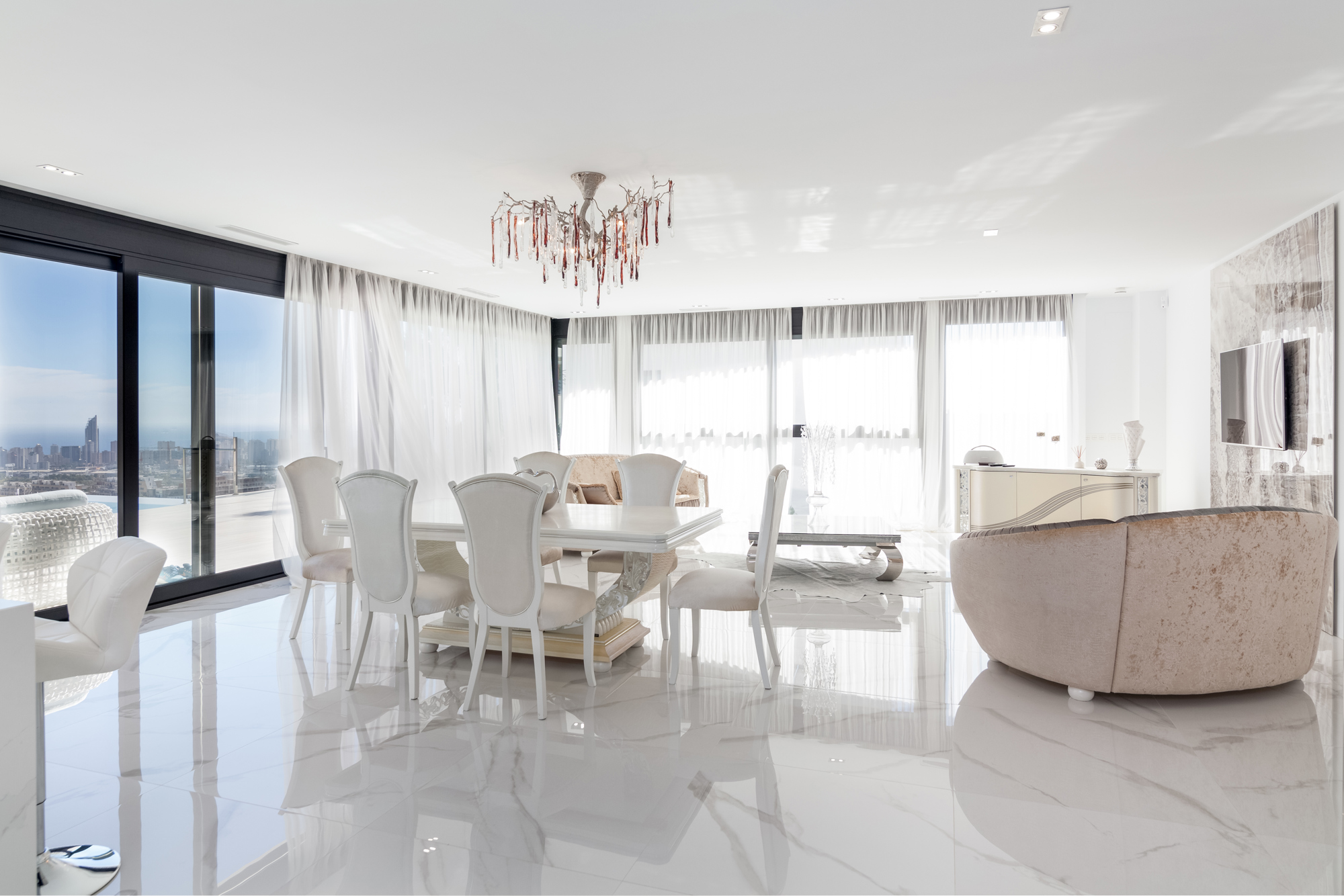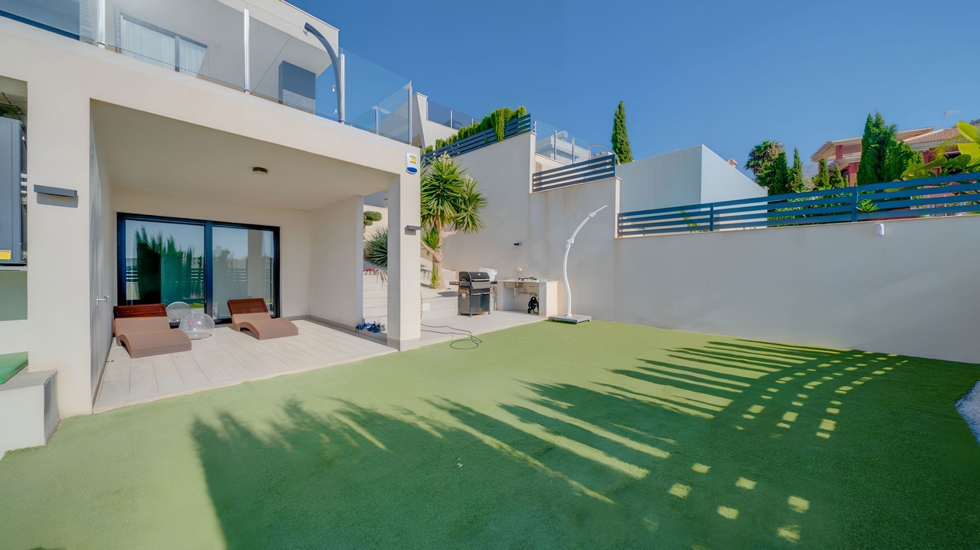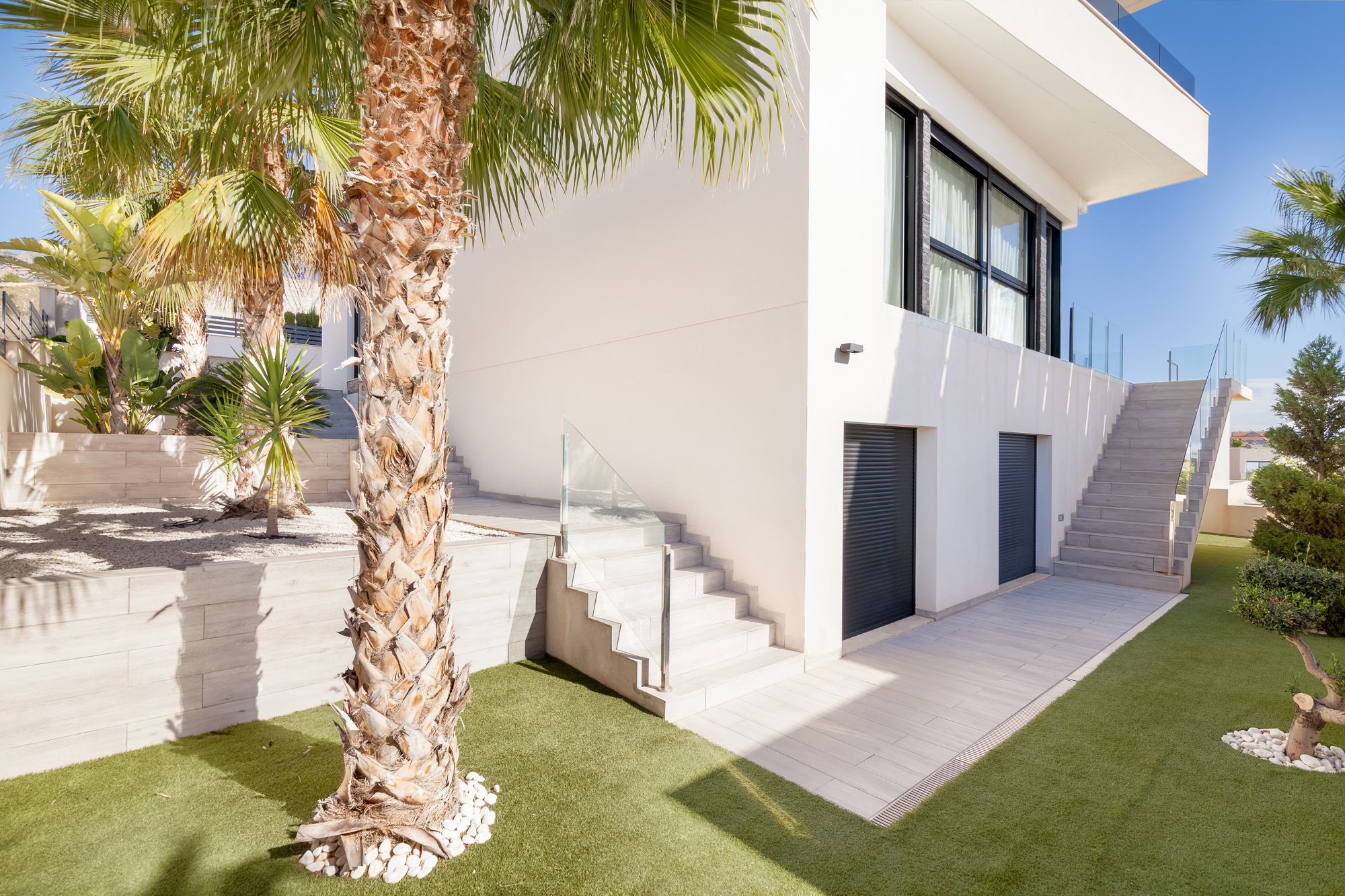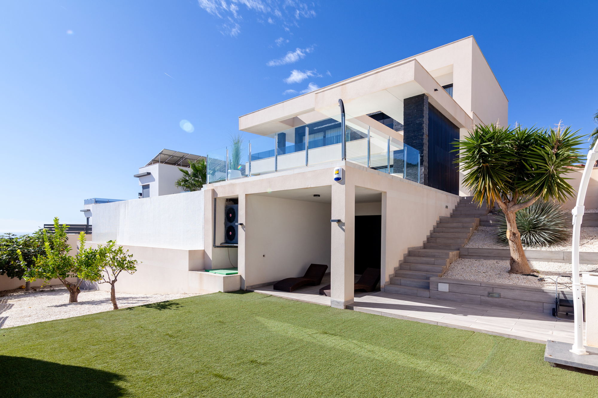 В этом доме есть две террасы. На большой террасе есть "бесконечный" бассейн с видом на горы, море и небоскребы города Бенидорм. Вторая терраса с видом на сад.